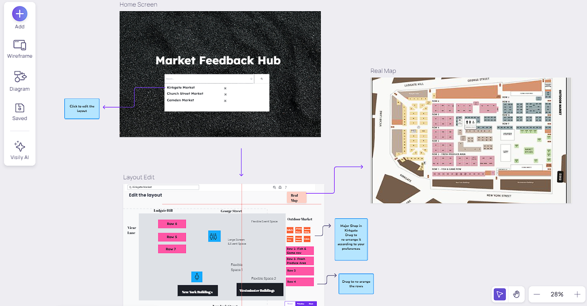 The “Market Feedback Hub” is a potential way for people to provide suggestions and their ideas on how to improve the markets. This idea is solely based on the findings we have encountered during our research on the Kirkgate market. And we felt the need to empower the authority of people and the vendors in renovation and advancements in the market as we believe the market is a place for consumers and sellers. However, we find the usual feedback forms are not enough to include the creativity of people. Thus, with the help of digital media, we are providing a design layout for a potential app.